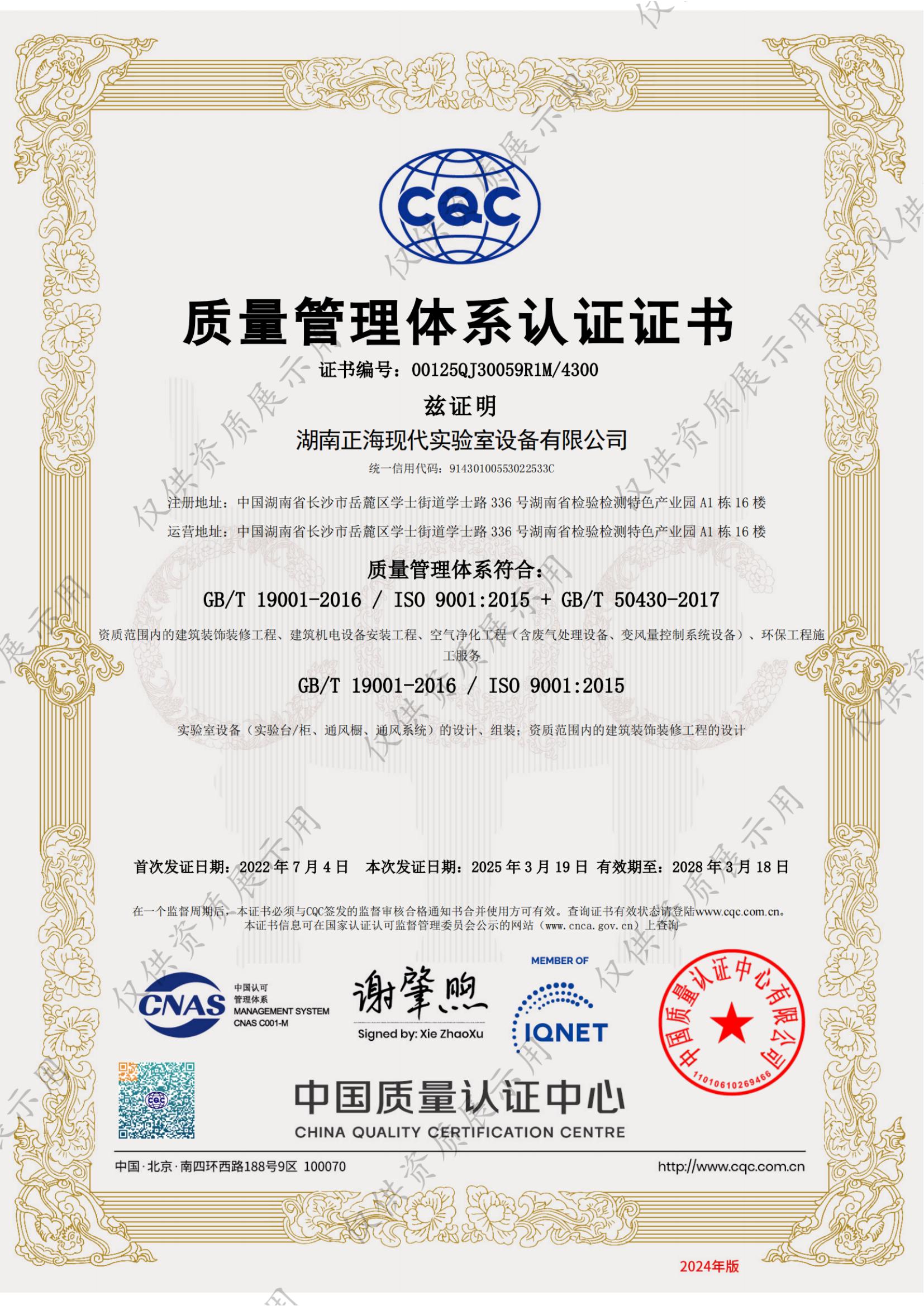 质量管理体系认证证书